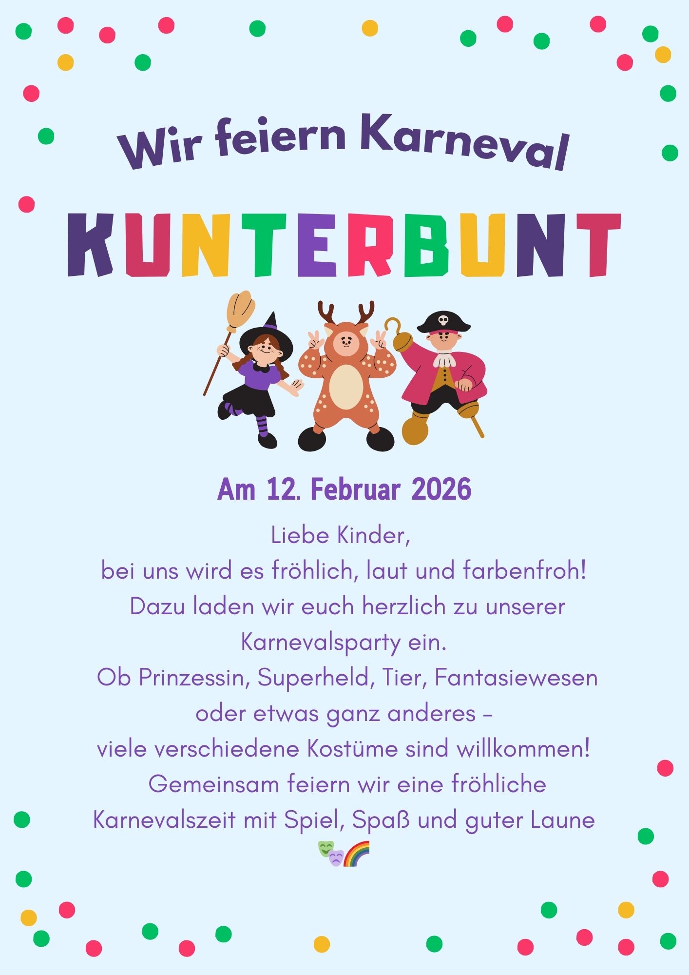 Unter dem Motto „Wir feiern Karneval kunterbunt“ haben wir in diesem Jahr ein fröhliches und farbenfrohes Karnevalsfest gefeiert.